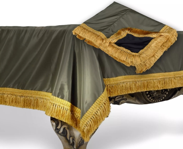 Мы предлагаем вам приобрести чехол для бильярдного стола. Данный чехол предназначен для стола размером в девять футов, у него влагостойкая пропитка, которая не позволяет воде дойти до бильярдного стола. Чехол выполнен из синтетики, это довольно прочный материал, который прослужит долгое время. Особенно подойдёт такое покрывало в том случае, если ваша бильярдная комната выполнена в классических оттенках, так как само покрывало серо-зеленое. По краю покрывала расположена жёлтая бахрома, эта бахрома украшает покрывало, делает его интереснее.